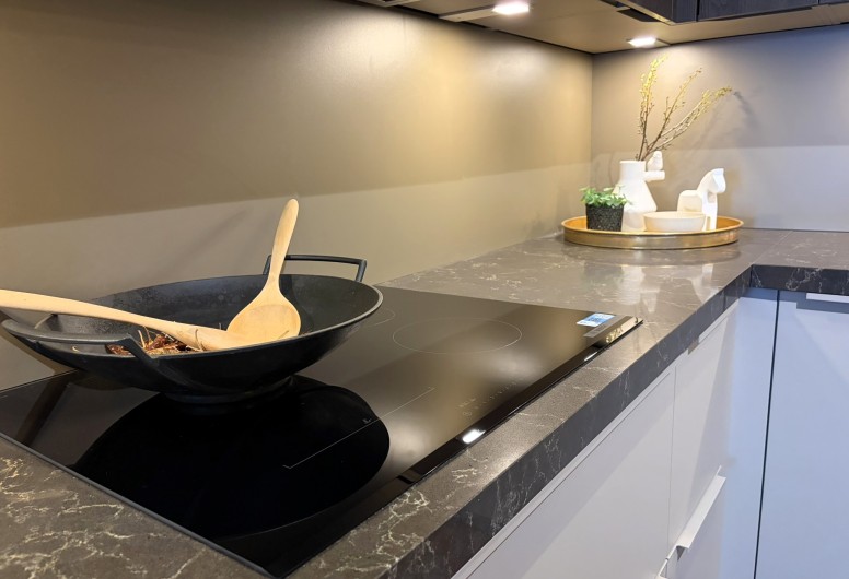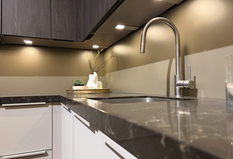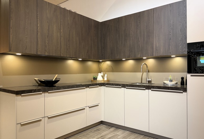 Ontdek de stijlvolle Baku Bali-keuken, vernoemd naar zijn kenmerkende greige onderkasten en smoked oak bovenkasten. Deze keuken combineert een moderne uitstraling met optimale functionaliteit. Met een Ceasarstone composietblad, slim ladesysteem in de onderkasten, fijne opleggreep, onderbouw spoelbak, inbouw afzuigkap, LeMans hoekkast, Bosch koelkast en een handige combioven op hoogte, biedt Baku Bali de perfecte balans tussen esthetiek en gebruiksgemak. Ontdek de elegantie en efficiëntie van Baku Bali in uw keuken.