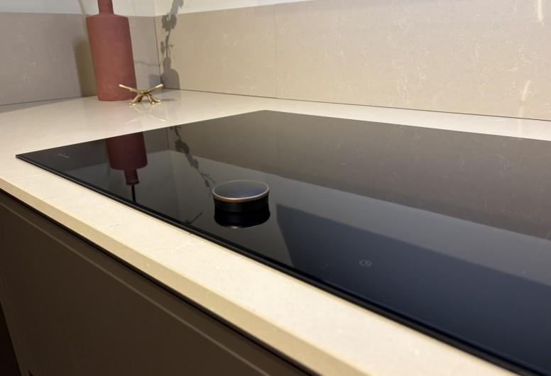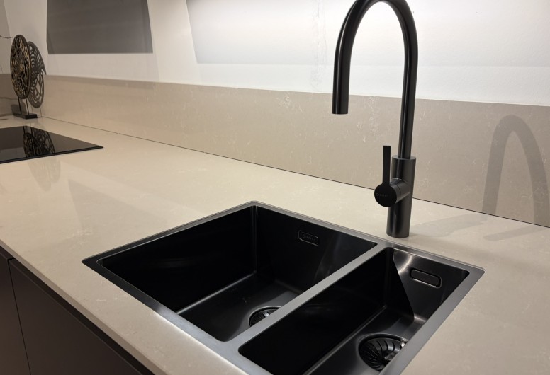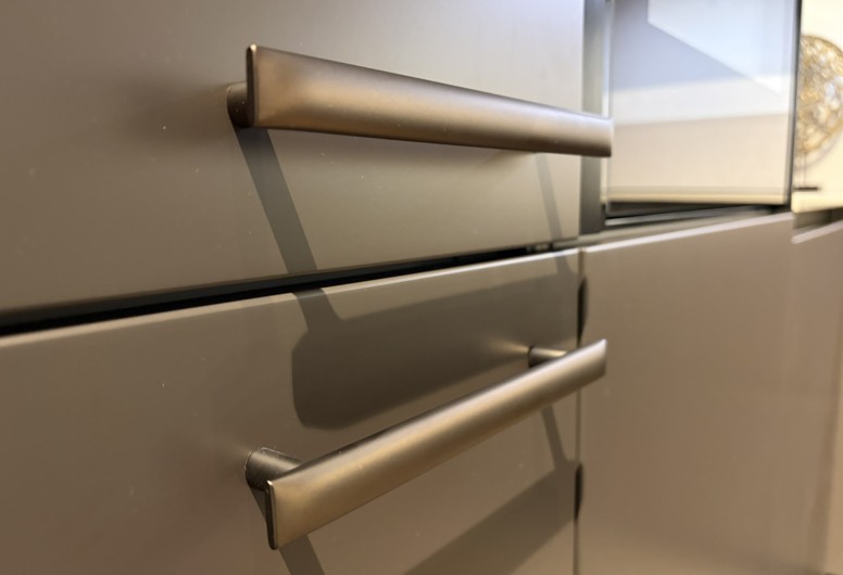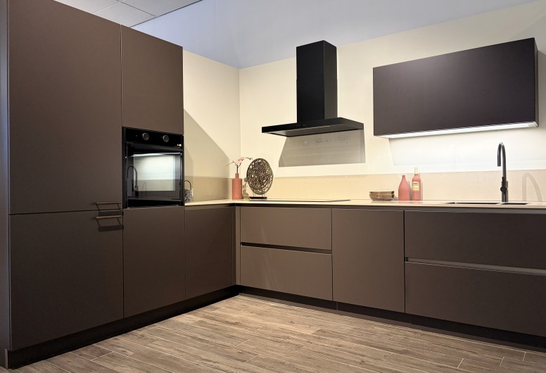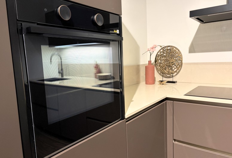 Deze stijlvolle showroomkeuken straalt luxe uit dankzij de sepiabruine fronten. Uitgerust met NEFF inbouwapparatuur: een innovatieve oven met inschuifbare deur. De NEFF inductiekookplaat en oven zijn beide voorzien van de magnetische TwistPad bedieningsknop, wat zorgt voor een strak design.