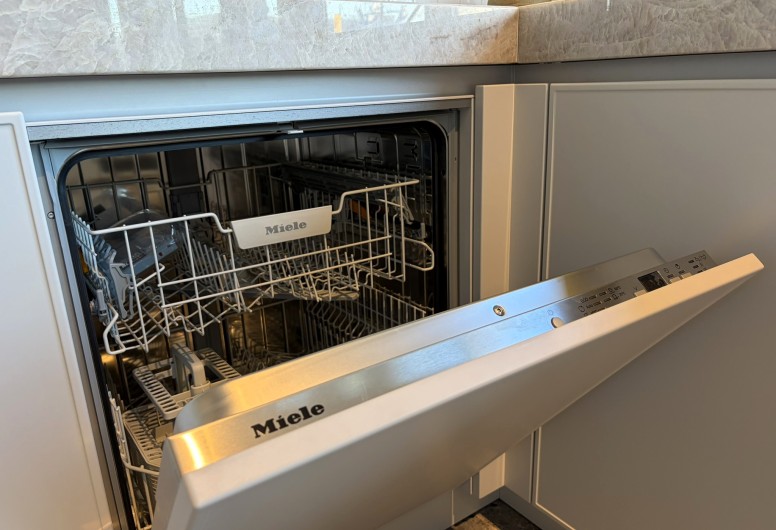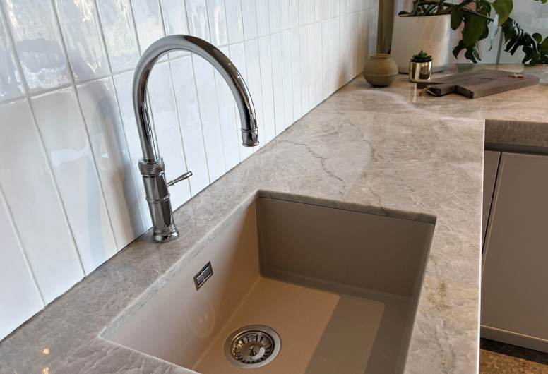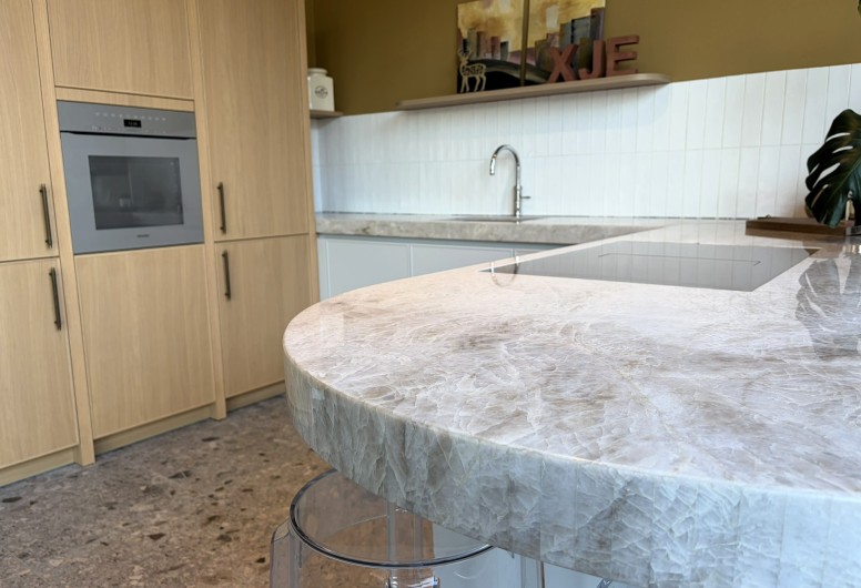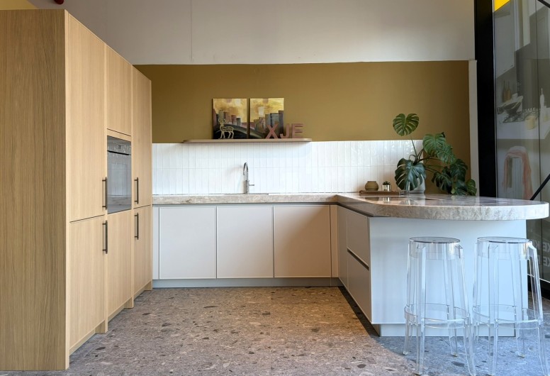 Deze japandi geinspireerde keuken straalt rust en luxe uit. Het afgeronde werkblad van exclusief Taj Mahal kwartsiet vormt een zacht en natuurlijk middelpunt. De keuken is voorzien van hoogwaardige Miele inbouwapparatuur, bekend om duurzaamheid en gebruiksgemak. De lichtgrijze fronten met kader creëren een tijdloze, minimalistische basis, terwijl de eiken fronten met kader warmte en natuurlijke balans toevoegen.